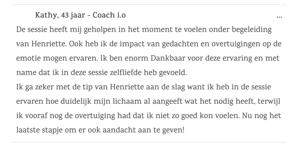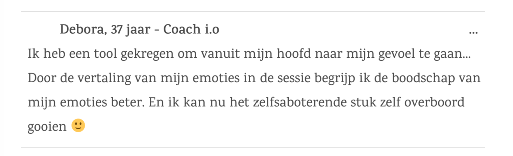 Stap voor stap borrelen inzichten op en voel ik steeds meer wat er bedoeld wordt met uit jezelf leven. Dus de sessie met jou samen….. een ommekeer in mijn leven en ik ben jou daar enorm dankbaar voor!!
