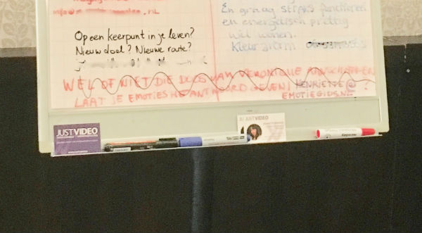 Als ik nou eens de net geleerde tip van Veronique, Refereer aan de pijn van je klant meteen toepaste? In de zaal stond een flip-over waarop we als publiek mochten connecten met elkaar. Je kon daarop schrijven wat je doet en wie weet zaten er potentiële klanten voor je in de zaal.